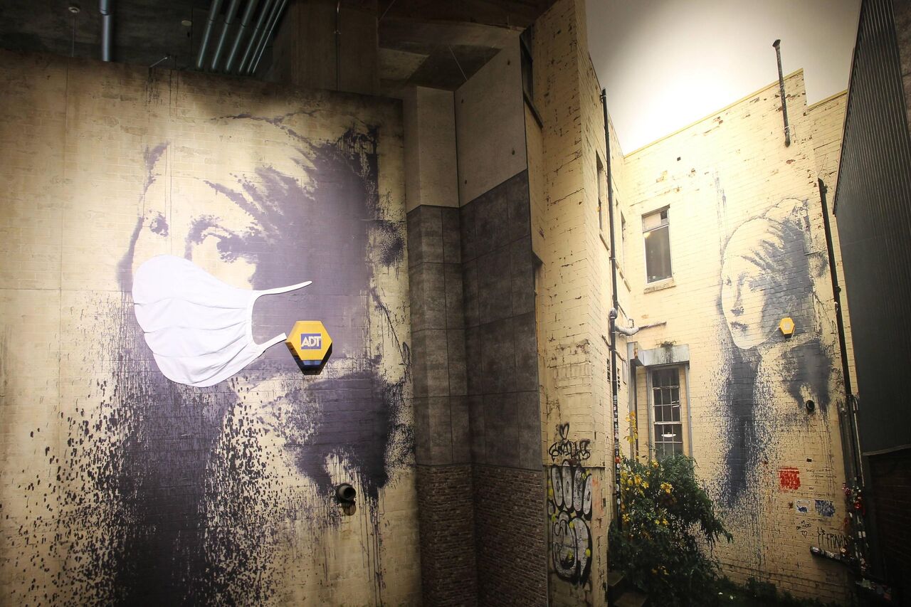 イギリスの諜報機関GCHQの近くの建物に描かれた、国家の監視活動を批判した作品