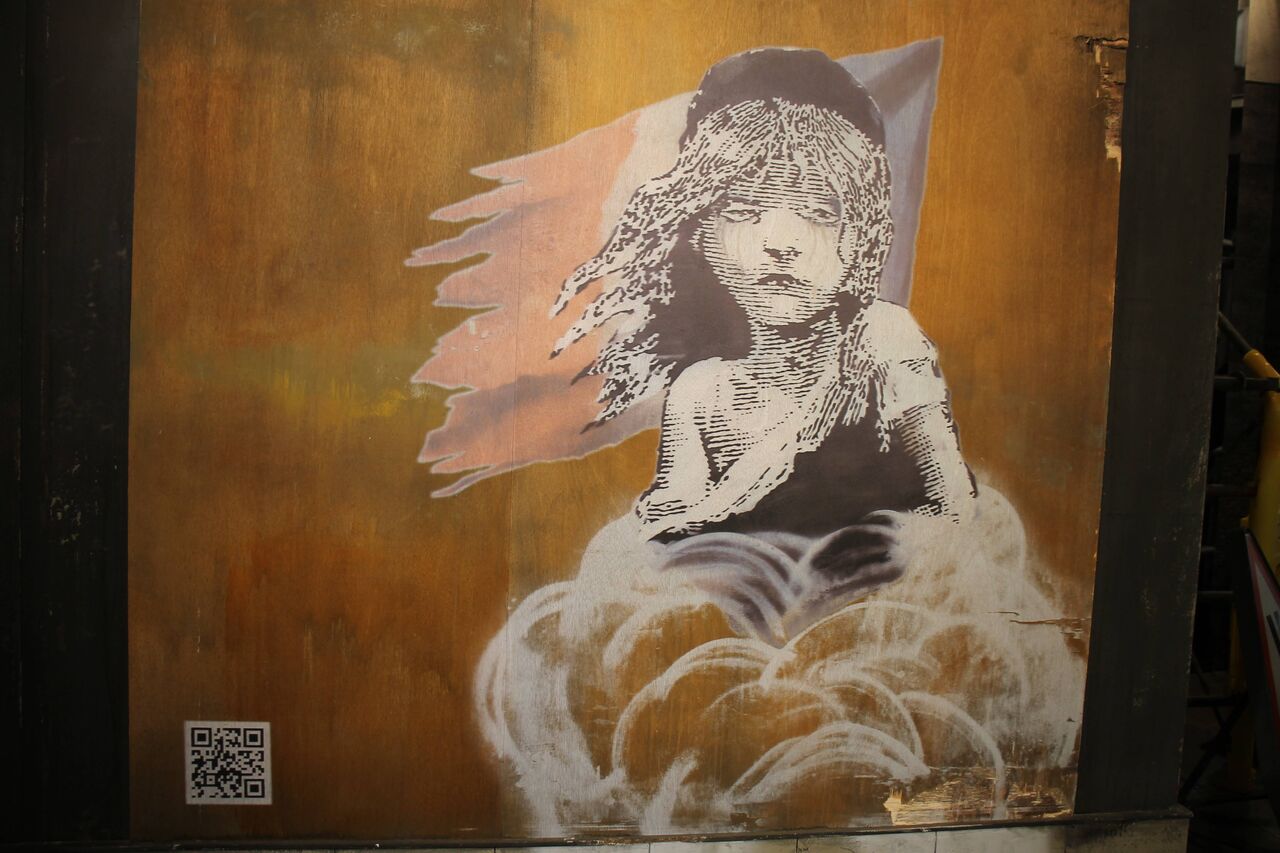 レ・ミゼラブルのポスターを元にしたパロディ壁画で、フランス、カレーの難民キャンプで催涙ガスが使用されたことへの抗議として描かれたんやって