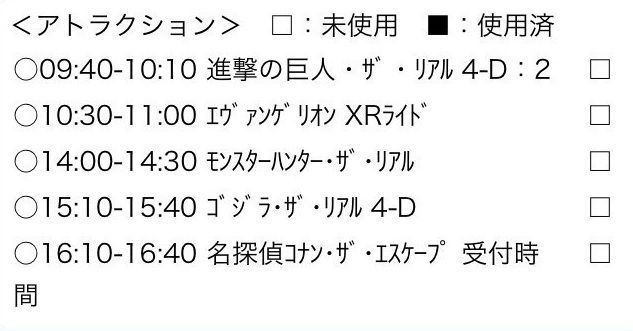 画像のタイムスケジュールでアトラクションば回っていくで!