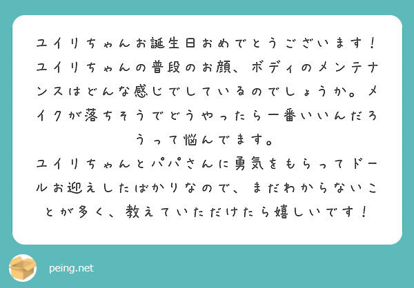 ユイリちゃんは濡らしたメラミンスポンジで顔を拭いてあげることが多いです! メイクを落としてしまうので、メイクは避けて拭いてあげてますね。 メイクの部分は汚れが目立っているわけではないなら拭いてあげなくてもいいと思うし、汚れが目立っているなら少し濡らしたテイッシュで優しく拭いてあげるのがいいのではないでしょうか?? お手入れに関する動画もYouTubeにアップしてますので良ければそちらもご覧ください♪