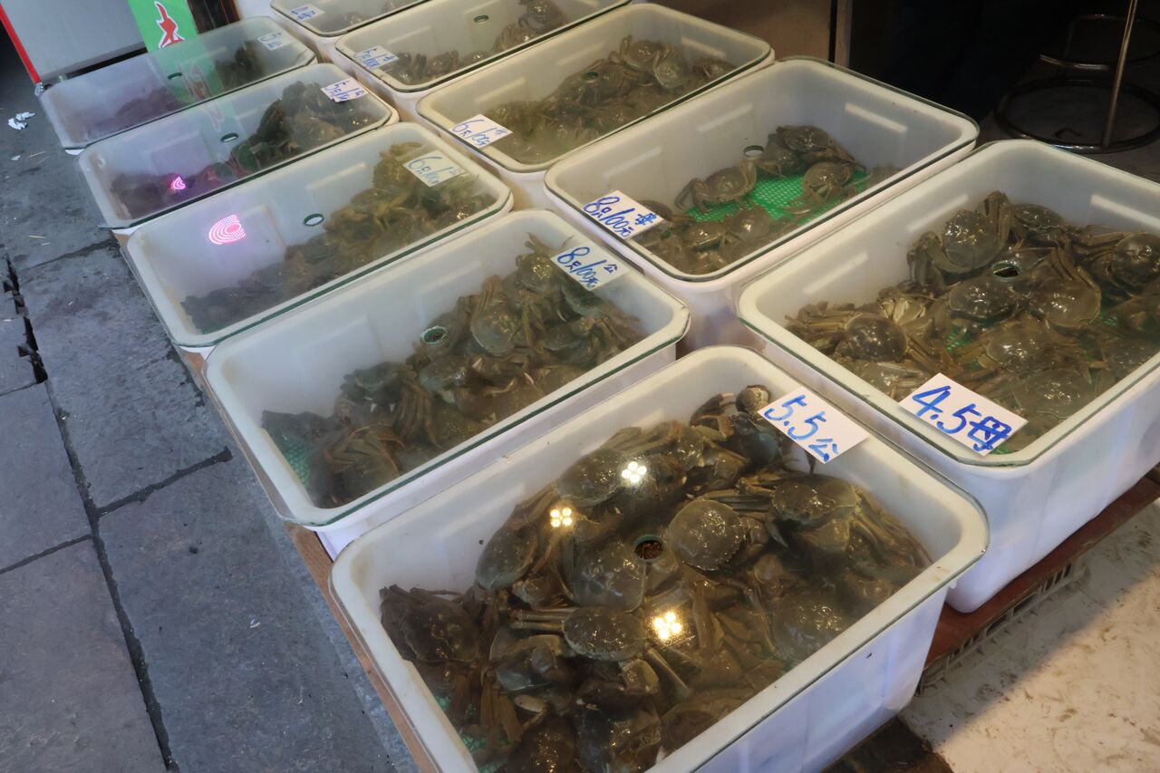 パパ「上海中心部では露店は禁止されてるみたいやけど、ここはOKなんやね。生きたカニがめっちゃ売られてたわ」