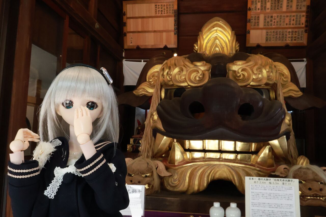 パパ「この神社には高さ2.4mの巨大な獅子の頭があるねん!」