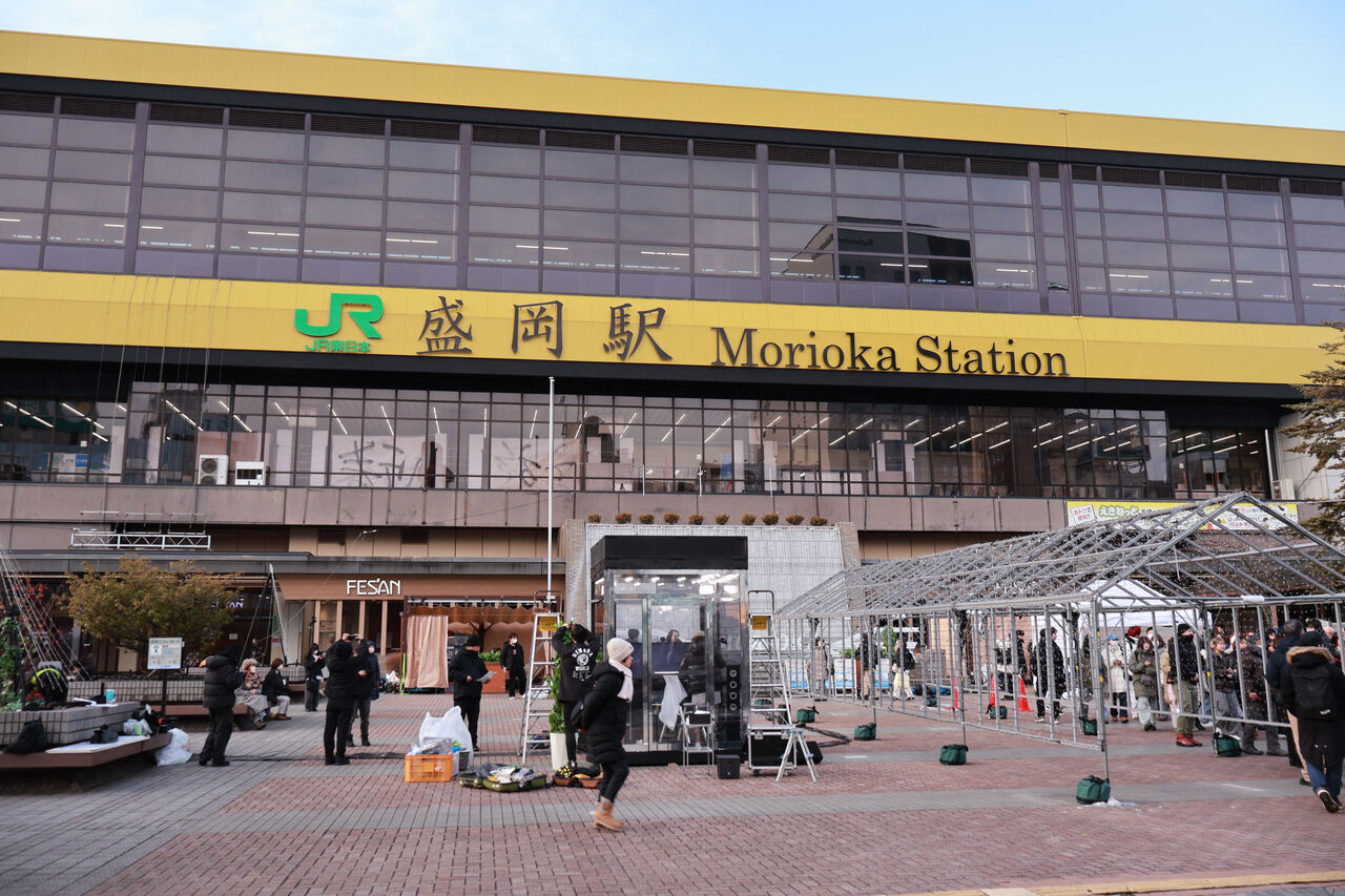 盛岡駅ではテレビ番組「モニタリング」の透明カラオケボックスの企画をやってたわ!寒いのに朝からたくさんの人が並んでたw