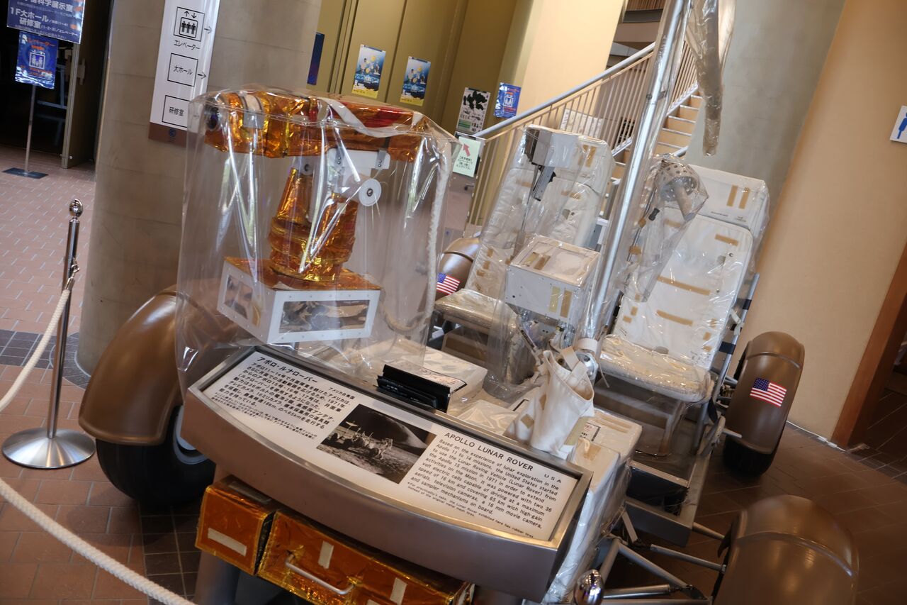パパ「施設に入場すると車がお出迎え!こちらはアポロ・ルナローバーって言って、アポロ15~17号で使用された月面車。36ボルトの電池2個で動いて、最高時速は16kmなんやって。本物は月面に放置されてるはずなので、展示されてるこちらは多分レプリカやね」