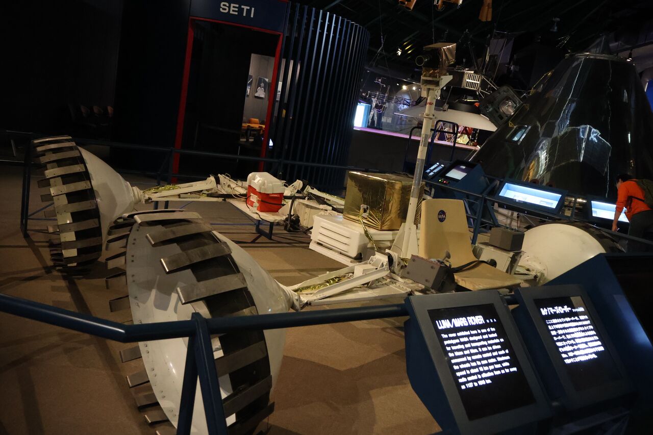 パパ「こちらはルナ・マーズローバー。NASAが月面や火星の走行を想定して開発したプロトタイプで、何度も実験された本物なんやって。モーターが車体じゃなくてタイヤに取り付けられてて、独立駆動する四輪タイヤでどんな地形でも小回りの利いた操作ができるんやって」