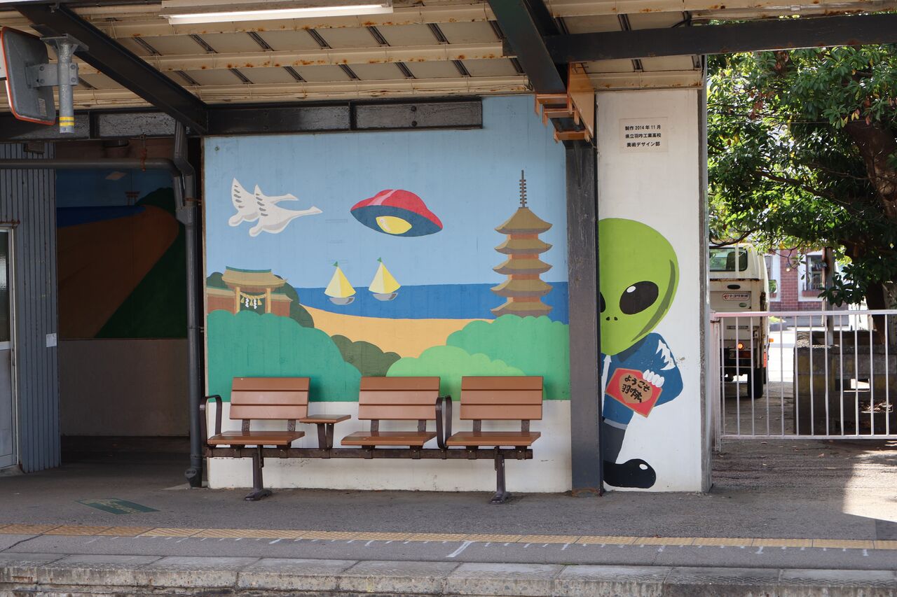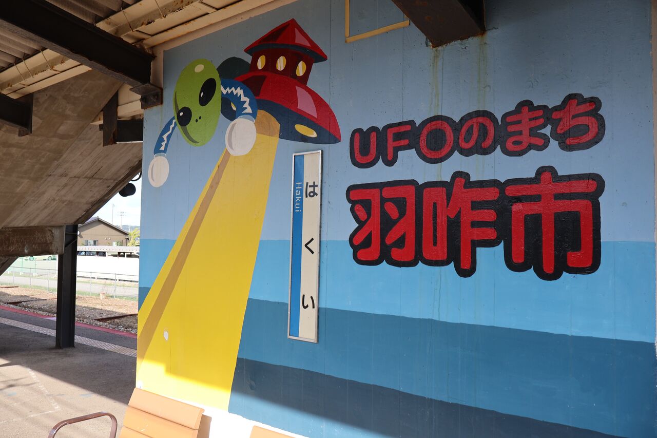 パパ「羽咋駅も壁にUFOのイラストがたくさん!」