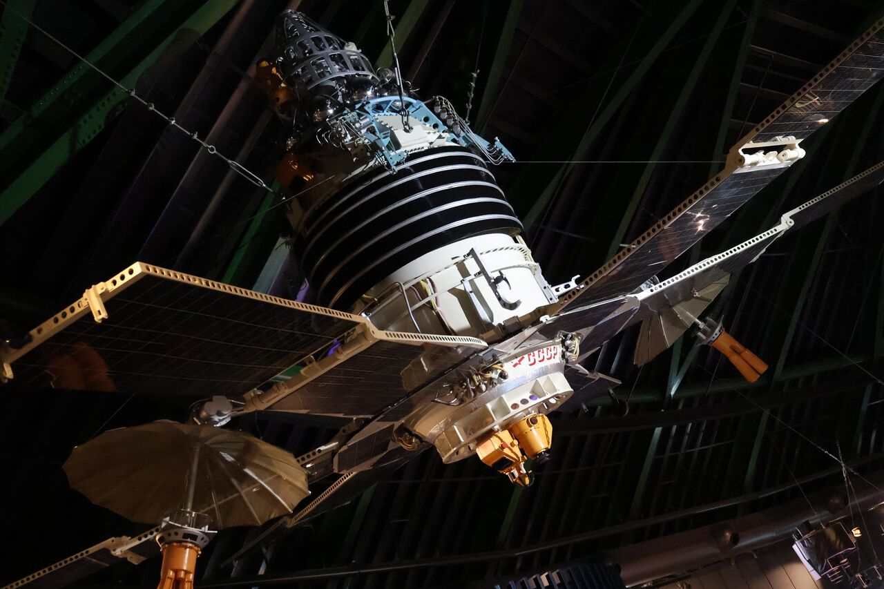 パパ「こちらは旧ソ連のモルニアサテライト。1965年から1972年に打ち上げられた当時最大級の人工衛星。地球の1/6を占める旧ソ連全域にラジオとテレビの同時放送を可能にしたんやって。でも中心部には偵察用のカメラがついてて、冷戦当時の時代背景がうかがえるね」